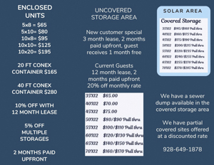 We have covered and uncovered gravel storage sites along with some partially covered sites that are discounted from 10%- - 50% off. Most of our sites are 12’ wide and we offer a 15% reduced price on our 10’ wide sites. Our new Storage is secured and gated with 24/7 access! We have on-site