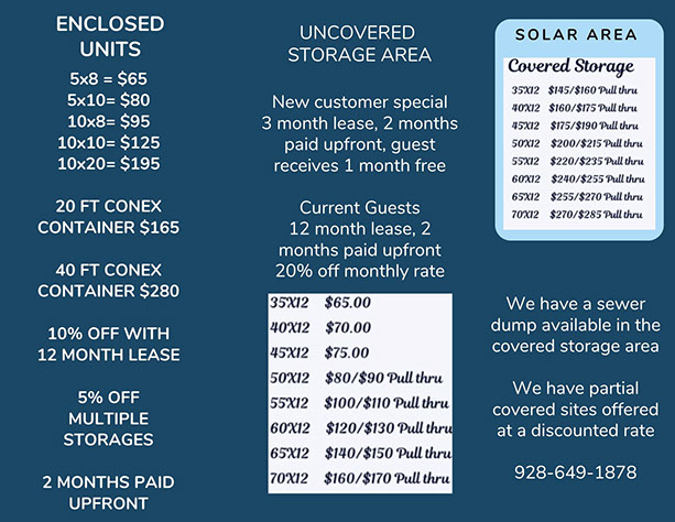 Cottonwood Springs has two Storage areas located at 420 and 465 Happy Jack Way, adjacent to our RV Park. We have enclosed storage units and Conex storage containers. We recently opened a new Storage facility that includes covered sites. We have SPECIAL pricing for new guests and offer 1 month free with a 12-month reservation. We have covered and uncovered gravel storage sites along with some partially covered sites that are discounted from 10%-50% off. Most of our sites are 12’ wide and we offer a 15% reduced price on our 10’ wide sites. Our new Storage is secured and gated with 24/7 access! We have